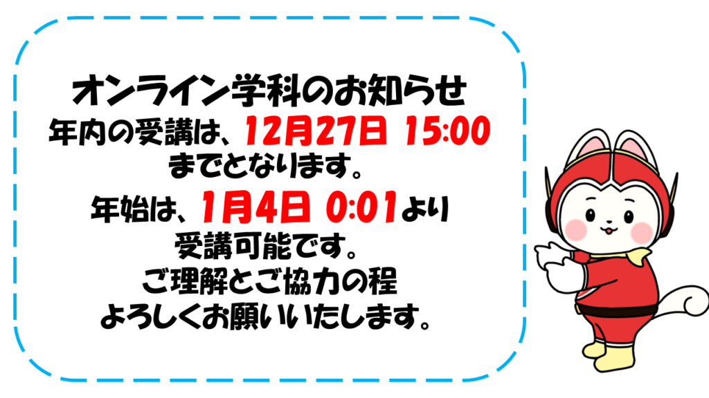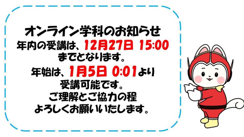 2025.12.18 年末年始オンライン学科受講のお知らせ お知らせ 年内のオンライン学科は、12月27日(金)15:00まで受講可能です。 年始は、1月5日(日)0:01より受講を再開いたします。 何卒ご理解とご協力のほど、よろしくお願いいたします。