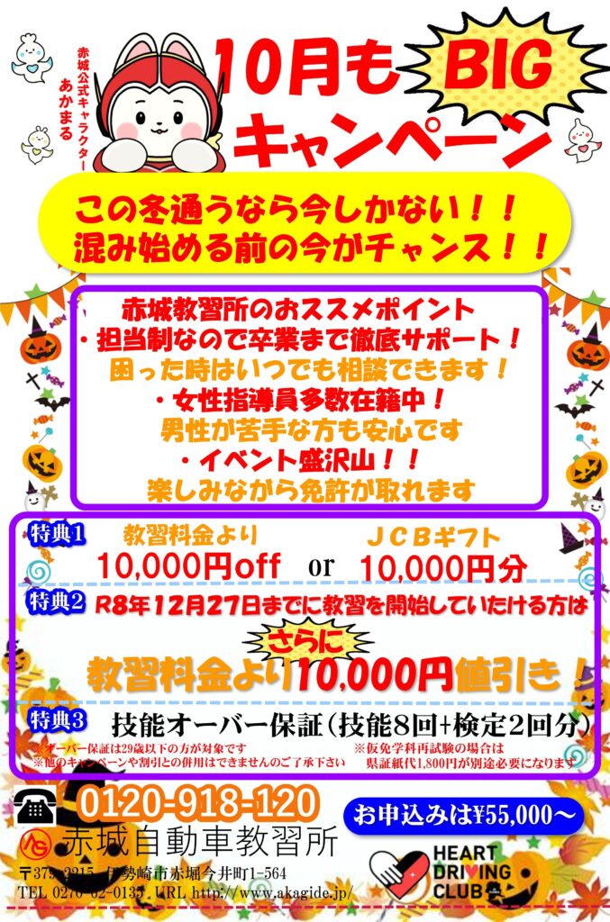 2025.10.1 10月キャンペーン実施中!!(普通車・準中型 ※審査除く) キャンペーン 10月中にお申込みして頂いた方は、教習料金より10,000円値引き又はJCBギフト10,000円プレゼントさせていただきます。 オンライン学科教習実施中! 自宅で24時間いつでも学科教習が受けられます! お気軽にお問合せください。皆様のご来店を心よりお待ちしております。 ※各種キャンペーン等は他の割引制度との併用はできませんのでご了承ください。 TEL :0270-62-0135 フリーダイヤル:0120-918-120 【お問合せ・web申込はコチラ】 担当 多賀谷・岩川